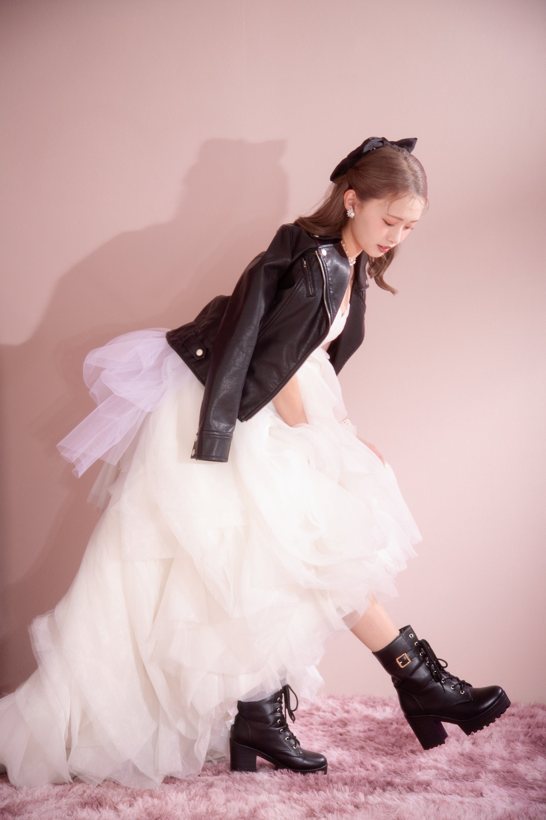 レザージャケットやブーツで甘辛ミックスを演出していて