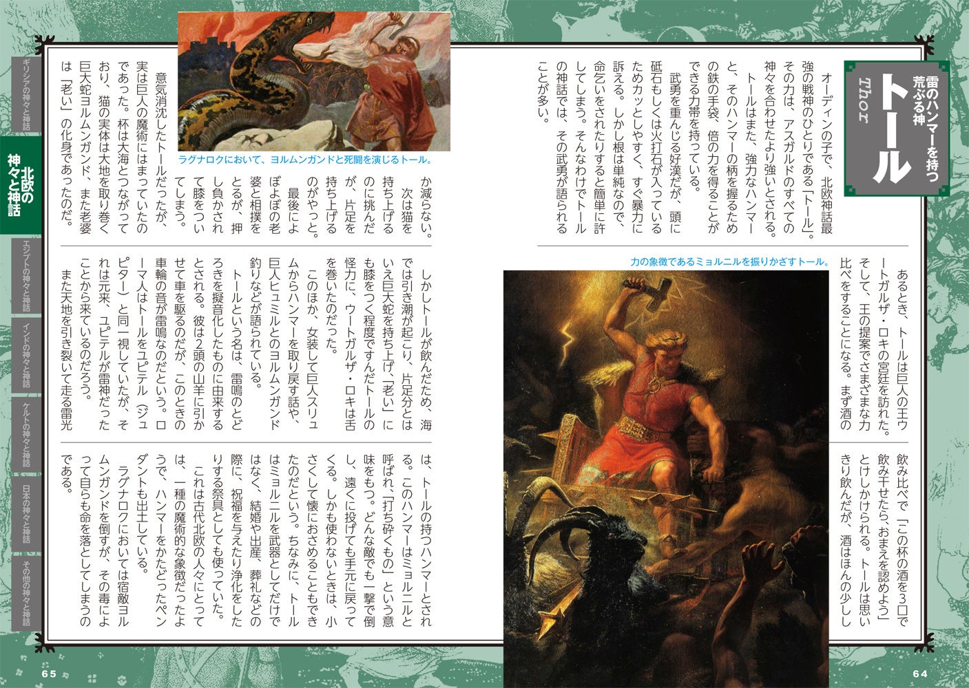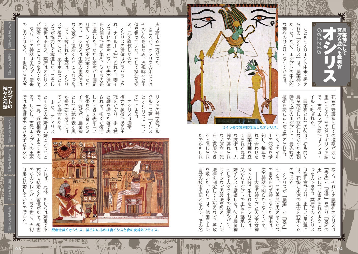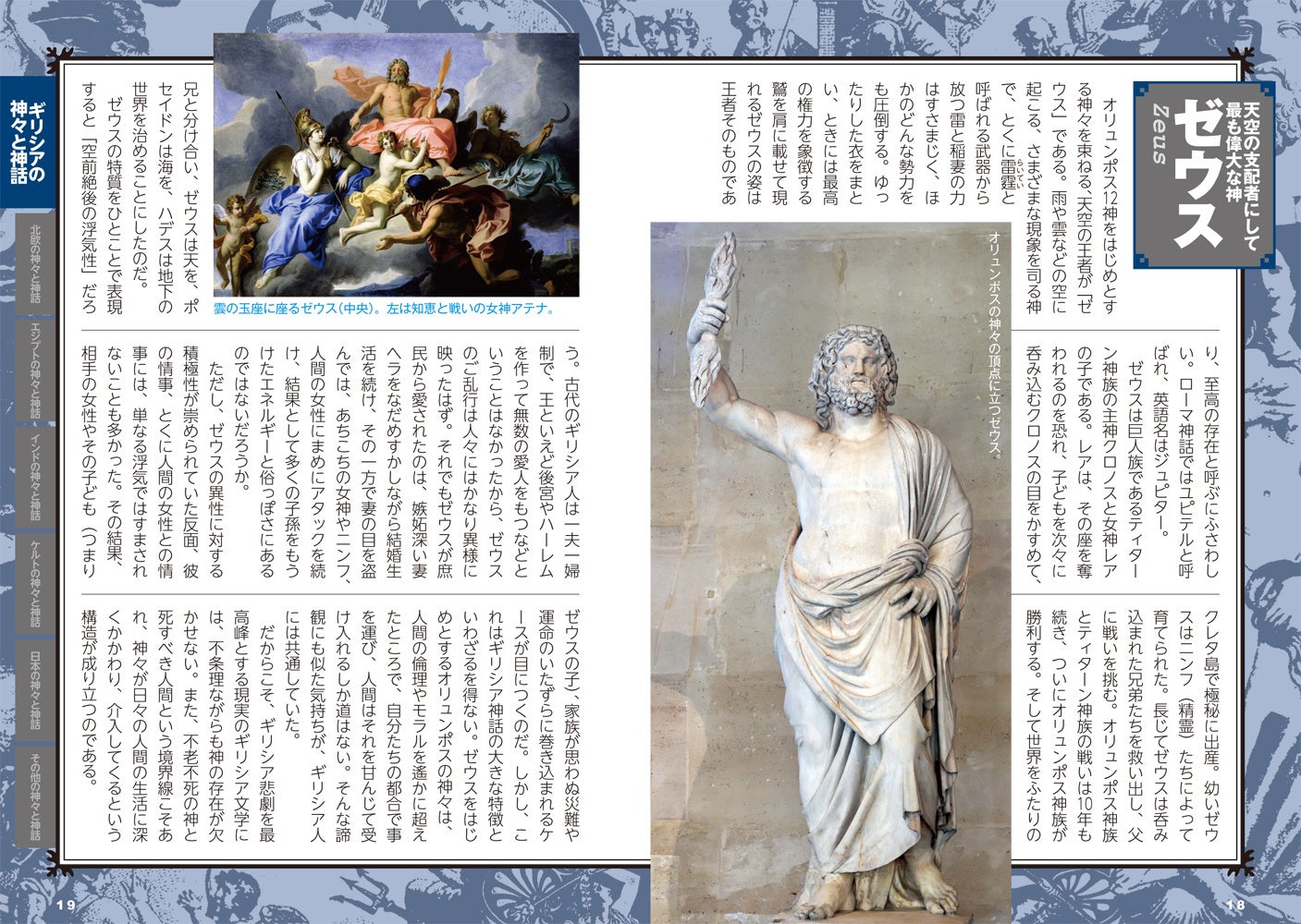 雷霆を持つゼウスや竪琴を持つアポロン(ギリシア神話)、鎧と兜に身を固め、戦場を駆け抜ける9人の乙女ワルキューレ(北欧神話)、王冠をかぶり、手に杖と鞭をもったオシリス(エジプト神話)など、その神がどのような顔や姿をしていたのか、何を持っていたのか、などの特徴も、豊富な図版とともに解説しています。