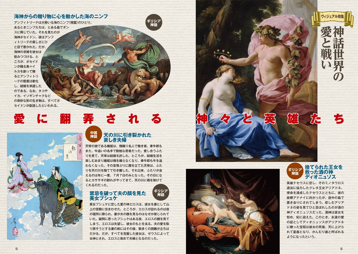 二度も愛する妻を失った悲劇の英雄オルフェウス(ギリシア神話)、滅ぶことを覚悟しながら、神々が挑んだ最後の決戦ラグナロク(北欧神話)、美女を救ったスサノオ命の巨大妖怪退治(日本神話)など、世界の神話には、多くの愛と戦いの名場面があります。巻頭特集では、神々や神話を概説するとともに、神々たちが繰り広げたさまざまな物語を、名画とともに紹介。