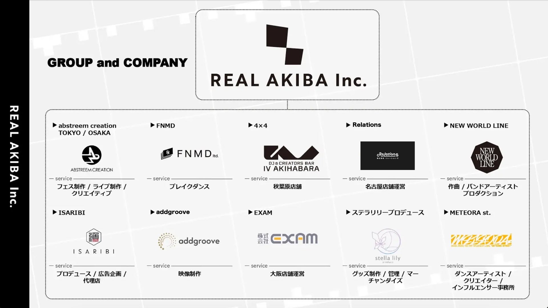 株式会社リアルアキバ は、“秋葉原”・”ダンス”・“音楽”、それらに付随するすべてのカルチャーを世界に発信していくことを目的とし、各社が築いてきた企画・クリエイティブ制作・ネットワークを結集し、エンターテインメントとテクノロジーを掛け合わせた新しい価値の創出を目指して設立されました。レペゼン秋葉原ことREAL AKIBA BOYZを筆頭に、人気沸騰中のO-MENZ、アニソンアーティスト「fhána」「岸田教団&THE明星ロケッツ」「DOES」、インフルエンサーにおいては、牛丼2000日を達成した「マナリス」、「ラブマツ」など多くの所属するタレントの力を結集し、日本のオタク・ダンス・アニメ・アニソンなどのコンテンツが世界中で愛される世界を創っていきます。
