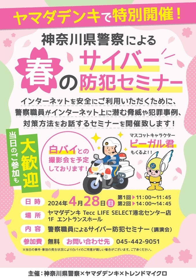 株式会社ヤマダホールディングス(本社:群馬県高崎市、代表取締役会長 兼 社長 CEO:山田 昇、以下、ヤマダホールディングス)は、神奈川県警察によるサイバー犯罪の被害防止に向けた取り組みに賛同し、2024年4月28日(日)にグループ企業である株式会社ヤマダデンキ「Tecc LIFE SELECT 港北センター店」において、神奈川県警察による「春のサイバー防犯セミナー」を開催いたします。