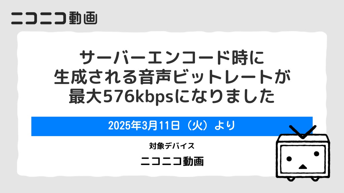 株式会社ドワンゴ(本社:東京都中央区、代表取締役社長:夏野剛)は、同社が運営する動画コミュニティサービス「ニコニコ動画」にて、投稿動画のエンコード時における音声ビットレートの上限を従来の192kbpsから最大576kbpsへと引き上げ、より高品質な音声の動画配信を実現します。新たなビットレートに対応する動画の投稿受付は2025年3月11日(火)から開始し、4月中旬より順次視聴が可能となります。