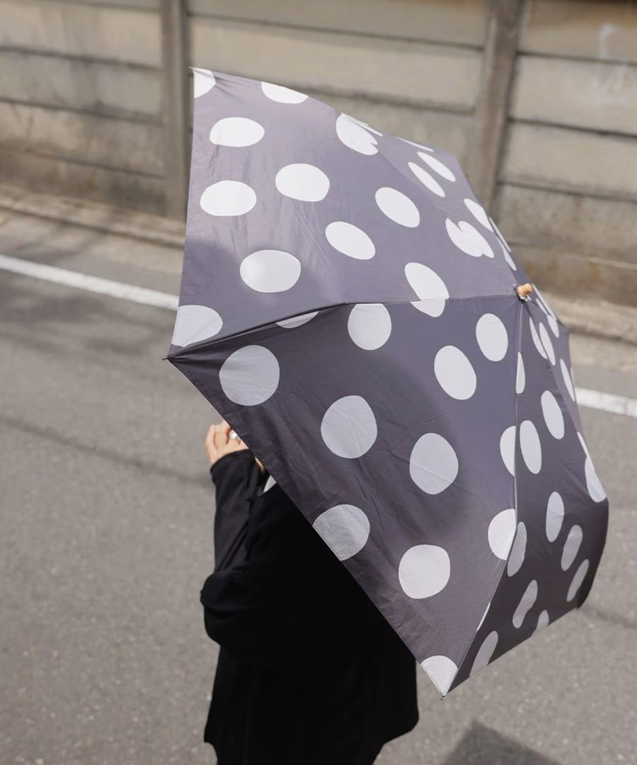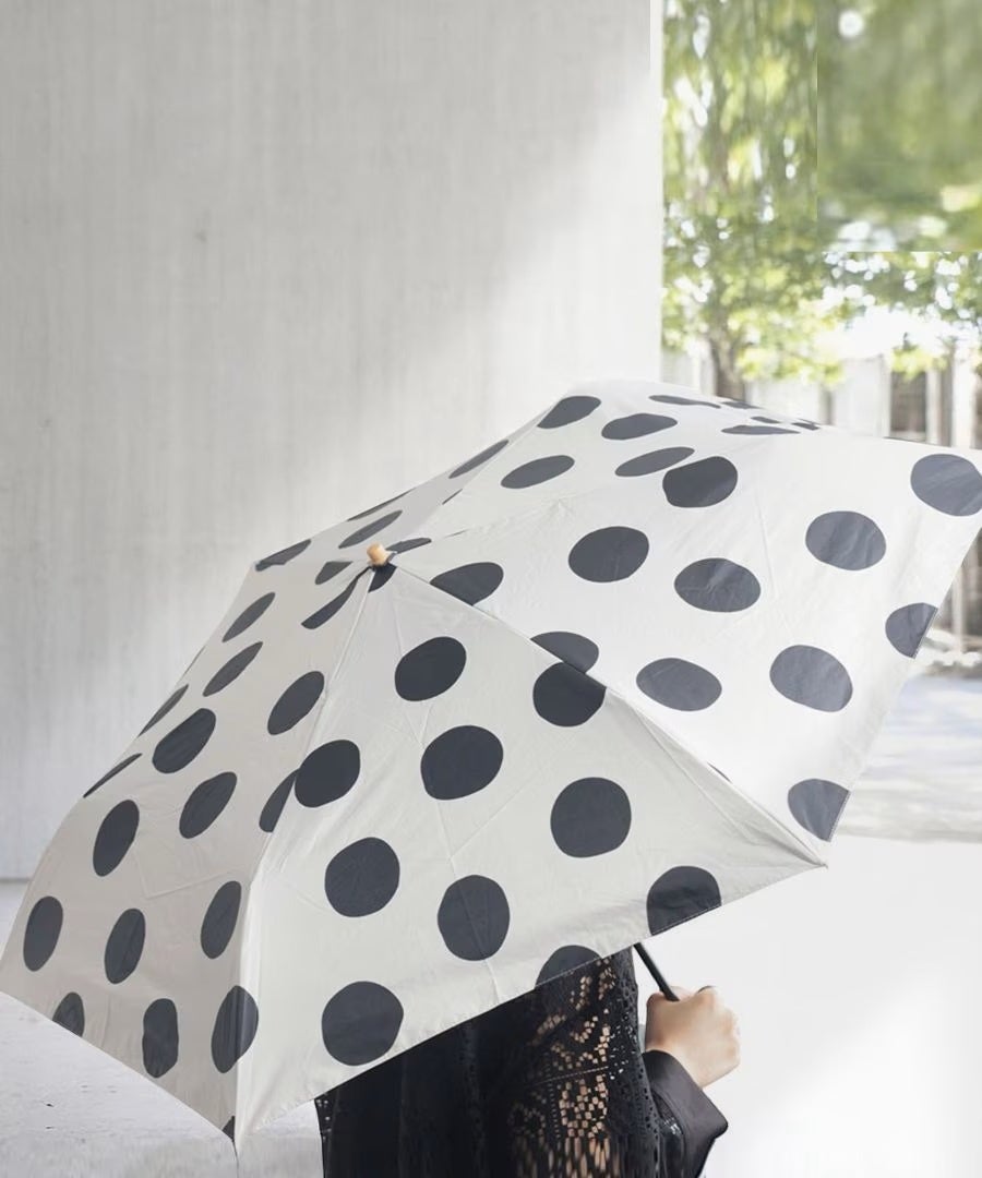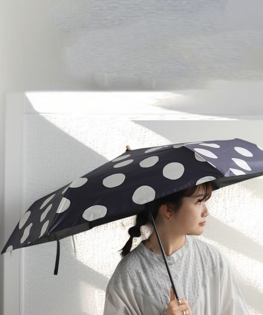 大胆なドット柄が印象的な晴雨兼用の折りたたみ傘。遮光率99.9%以上の機能性を持ちながら、デザインは主役級。