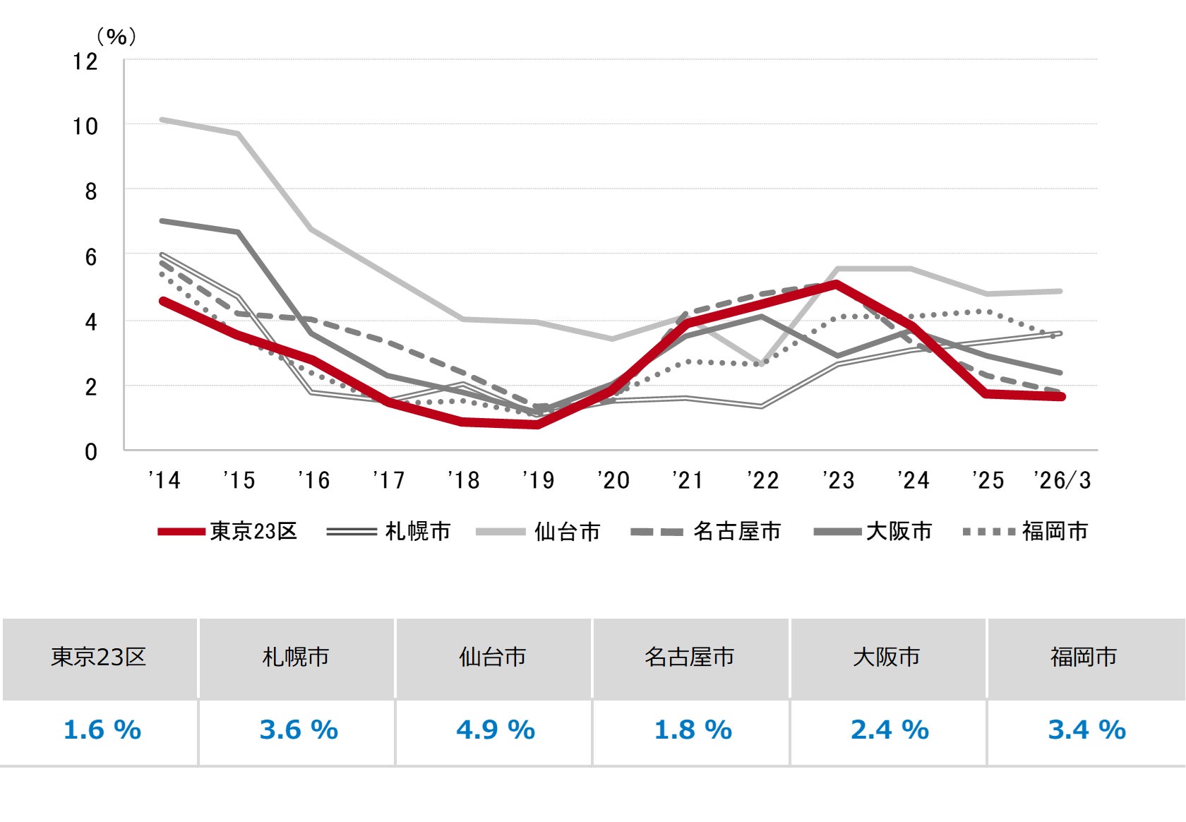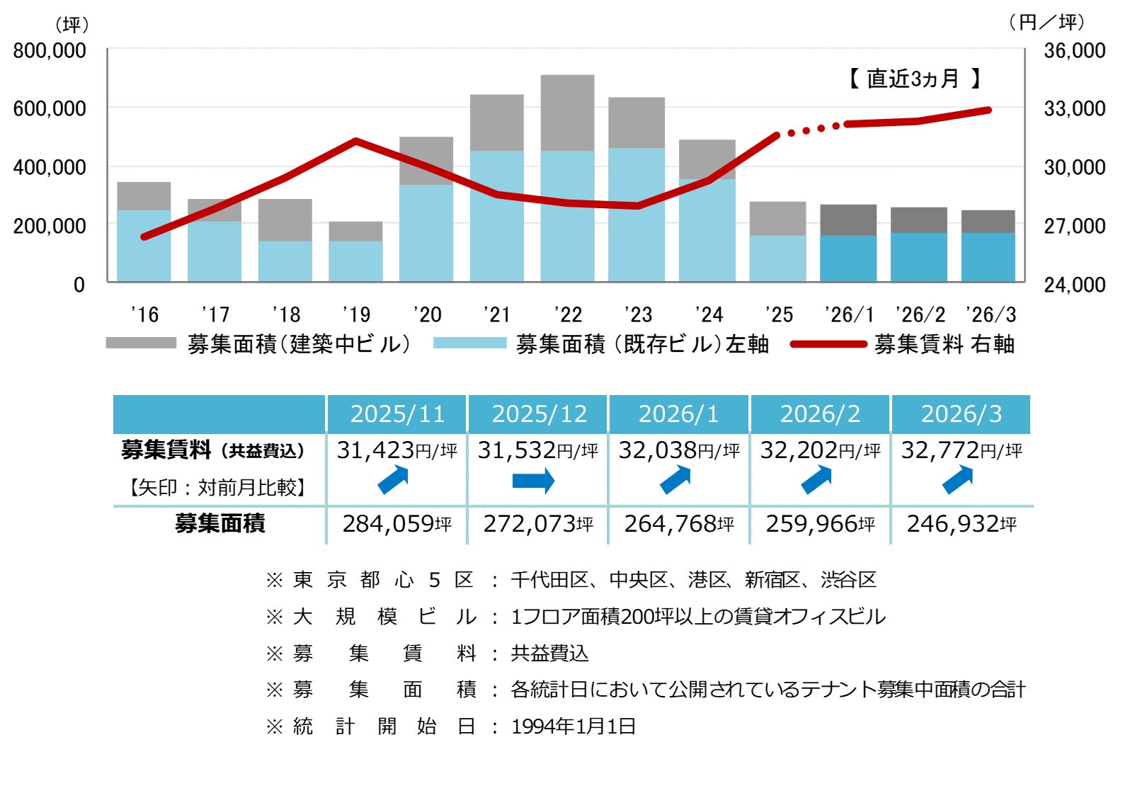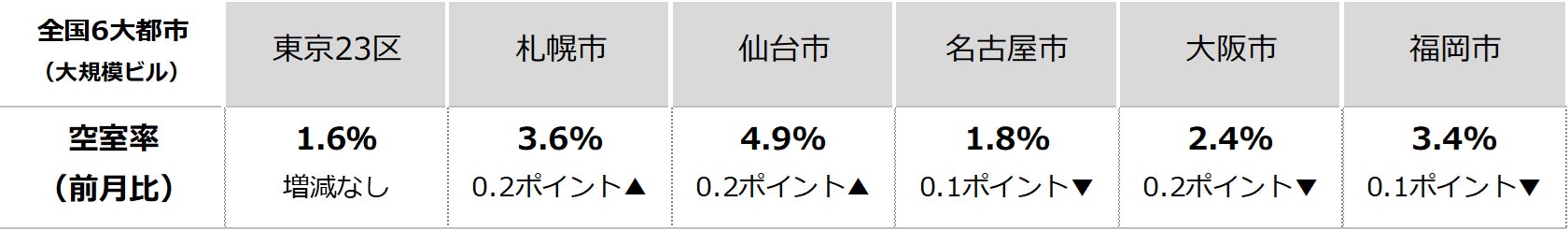三幸エステート株式会社(本社:東京都中央区、取締役社長:福島正二郎)は、2026年3月度の東京都心5区(千代田区、中央区、港区、新宿区、渋谷区)および全国6大都市(東京、札幌、仙台、名古屋、大阪、福岡)の大規模ビル※1のマーケットデータをまとめた「オフィスマーケット2026年4月号」を公表します。
