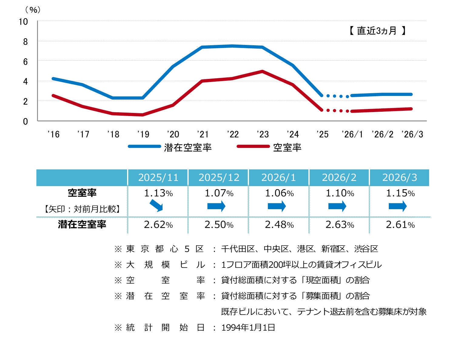 オフィス需要は活発な状況が続く一方、中東紛争の長期化により世界経済へ大きな悪影響が及ぶ可能性が高まっている。企業収益の悪化はオフィス需要の縮小に繋がるものの、それが各種データに反映されるまでにはタイムラグがある。都内の大規模ビルでは定期借家契約が多く、景気の悪化が直ちに解約の増加とはなりにくい構造にあるため、この点も踏まえてマーケットの動向には注意を払う必要がある。(市場調査室 今関豊和・津田宏美)