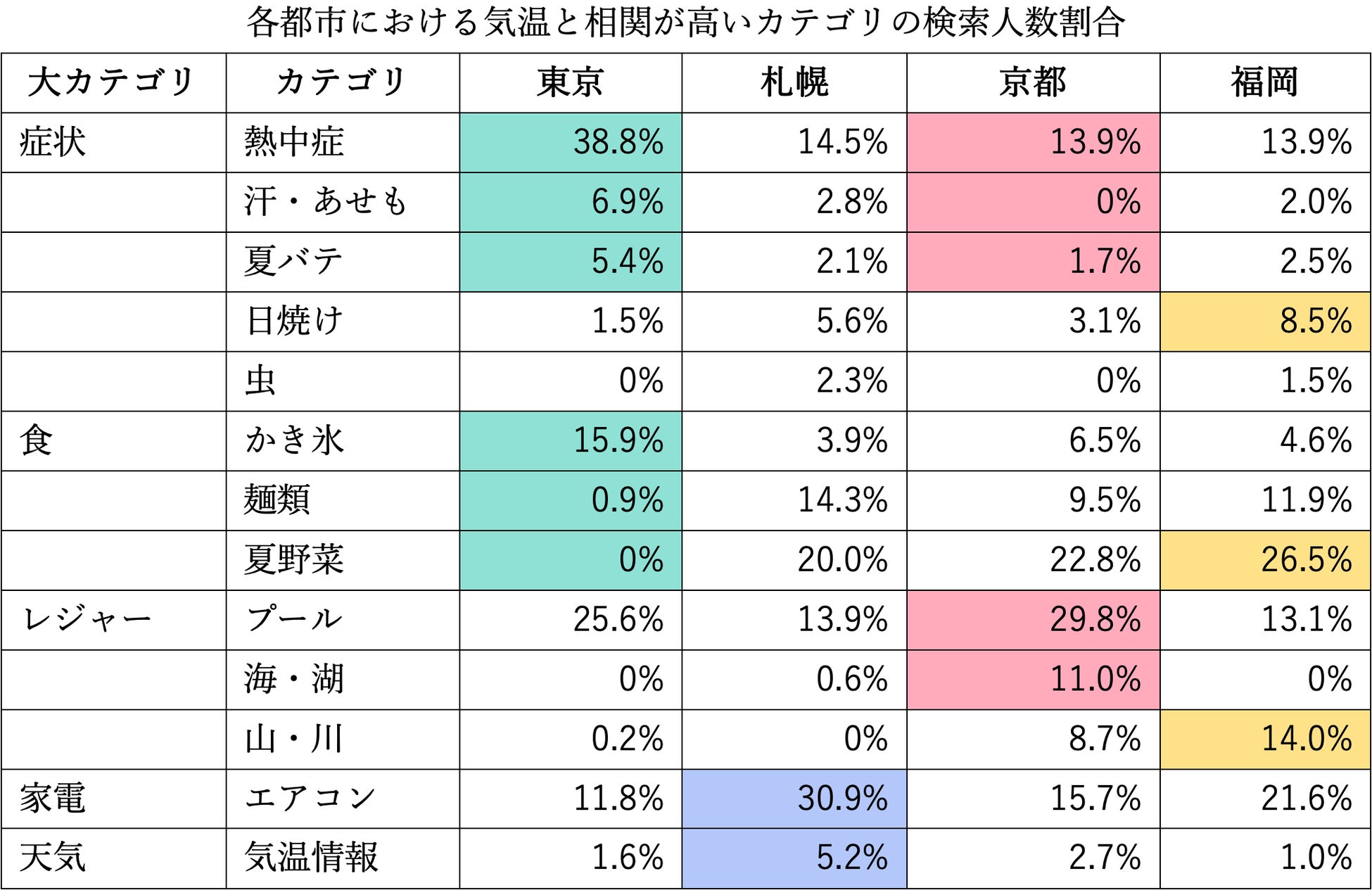 東京23区は「かき氷」、札幌は「エアコン」、京都は「水辺のレジャー」に関する検索が多め