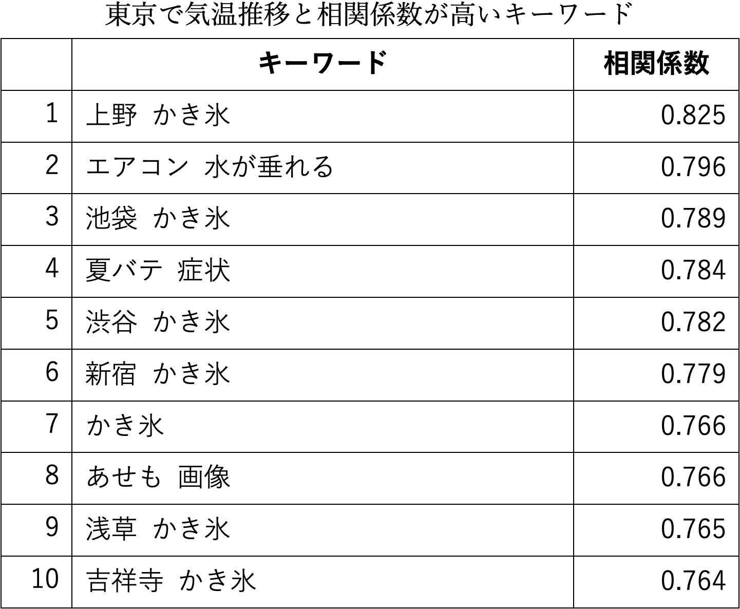 ■気温推移と相関係数が高いキーワードは、東京では「かき氷」