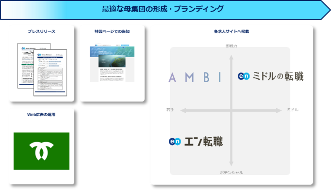 プレスリリースや特設ページ、Web広告での告知に加え、各求人サイトでの集客サポートを実施いたします。『エン転職』『AMBI』『ミドルの転職』とターゲットの異なる3つの求人サイトを活用することで、ターゲットへ網羅的に求人を届けます。