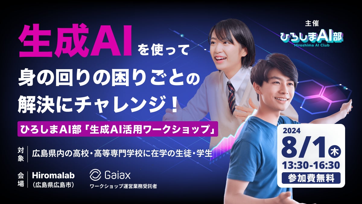 スタートアップスタジオを運営する株式会社ガイアックス(本社:東京都千代田区、代表執行役社長:上田 祐司、証券コード:3775、以下 ガイアックス)で、起業家教育事業の責任者を務める吉川と、インキュベーション事業で起業支援メンターを務める板垣が、広島県を始めとする産学官が取り組んでいる「ひろしまAI部(※1)」のワークショップに講師として登壇します。ワークショップでは参加者が、生成AIの魅力やリスクを正しく理解しながら、その具体的な使い方を学び、最後はMicrosoft Copilot(※2)を活用して身の回りの困りごとの解決にチャレンジします。