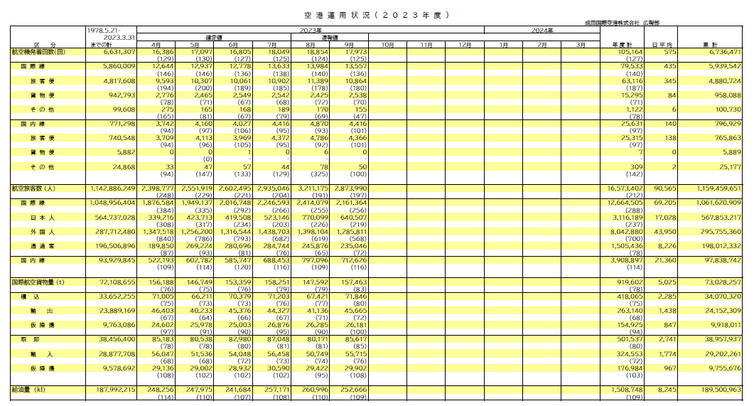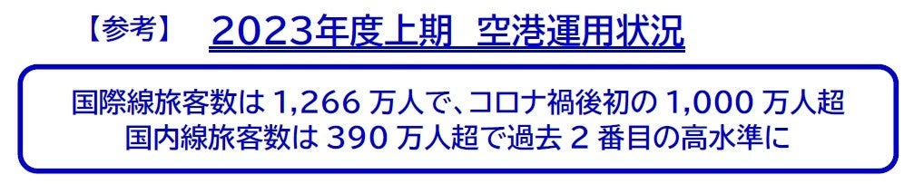 ●国際線は、昨年10月の水際対策の大幅な緩和や今年4月の水際対策の撤廃などを受けて、旅客数が1,266万人(前年同期比288%、2019年同期比68%)となりました。特に外国人旅客については、804万人(前年同期比700%)となり、コロナ禍前と比べても87%まで回復しております。発着回数は、63,116回(前年同期比187%、2019年同期比68%)となりました。