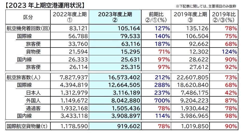 ●2023年度上期の航空旅客数全体は1,657万人(前年同期比212%、2019年同期比73%)となりました。
