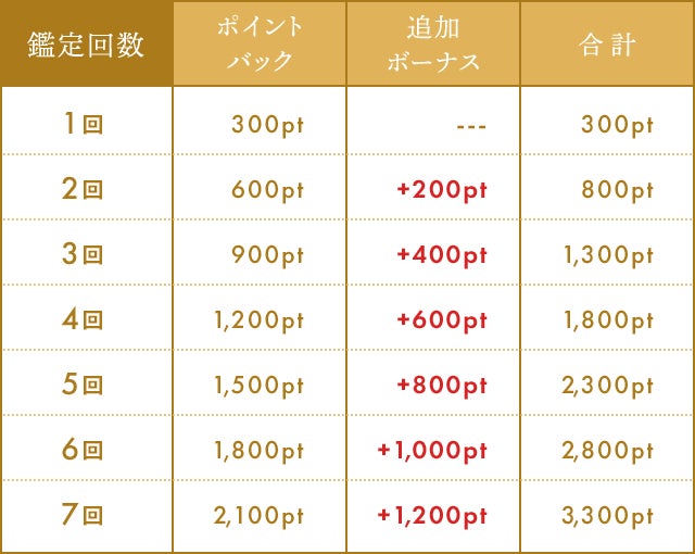 対象期間中に15分以上の鑑定を受けると、1回毎に300ポイントのポイントバックを受け取れます。さらに、鑑定回数が増えるごとに還元されるポイント数が増量されます。最大7回迄で3,300円分のポイント還元が受けられます。