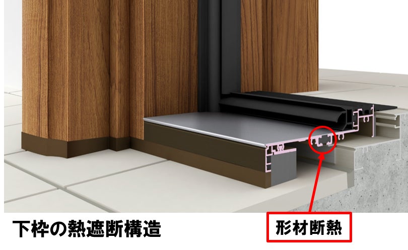 また、従来のカバー工法の課題として、外気温がマイナス15℃以下になるような寒冷地エリアにおいて、下枠の表面に発生した結露水が凍結し枠と扉が張り付くことで扉が開かなくなる懸念がありました。これに対し、下枠には熱遮断構造の形材を採用し新設枠自体が熱橋とならないようにすることで、室内側の結露の発生を抑制し凍結リスクを低減しました。
