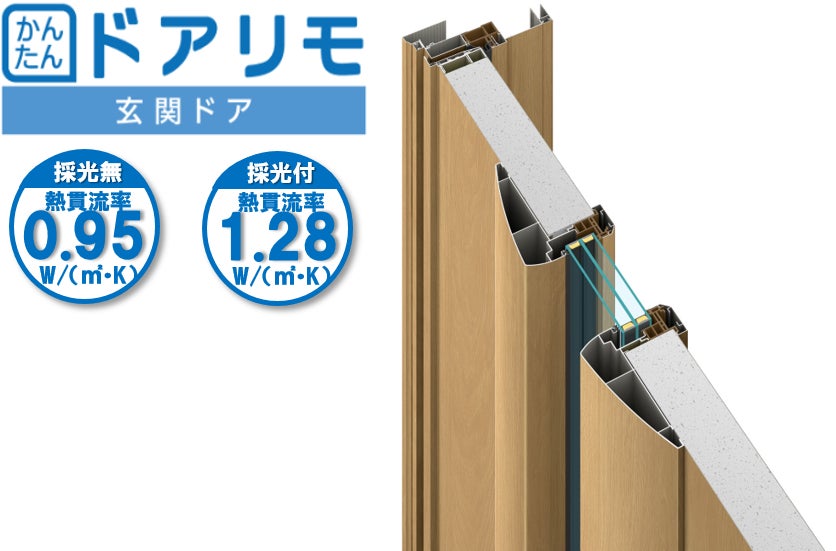 カバー工法の枠としては業界で初めてアルミ樹脂複合構造を採用。扉本体を厚さ70㎜にし、採光デザインの場合はダブルLow-Eトリプルガラス(アルゴンガス入)を採用することにより、住宅用玄関ドアリフォーム商品(カバー工法)でトップクラスの断熱性能を実現しました。無採光デザインは熱貫流率0.95W/(㎡・K)と、「先進的窓リノベ2024事業」の“SSグレード(最上位グレード)”、採光付デザインは熱貫流率1.28W/(㎡・K)と、 “Sグレード”の対象商品となります。