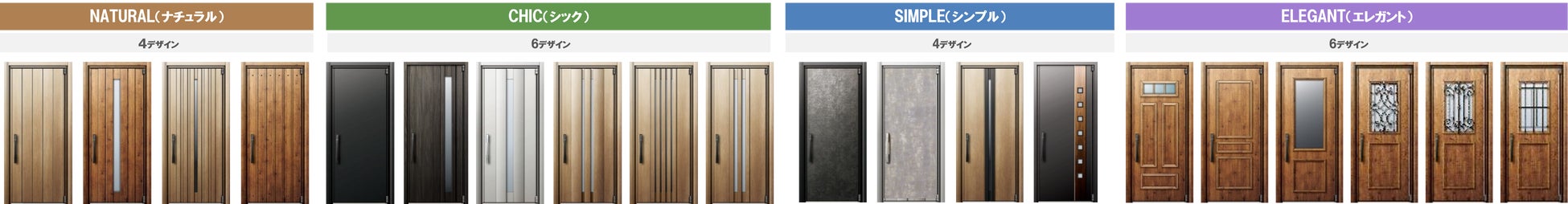 ナチュラル、シック、シンプル、エレガントの4つのデザインテイストに分類される全20デザイン、9カラーの多彩なデザインバリエーションを展開。採光付デザインも14種と充実させ、高い断熱性能を保有しながら、暗くなりがちな玄関に自然の明かりを取り込めます。また、カラーもアルミカラー2色の他に、トレンドに合わせた5種類の木調色と立体的な質感を表現するベイクドストーン、ブライトスタッコ(10月発売予定)の2色、計9カラーを用意。住まいの好み・暮らしに合わせたドアデザインをお選びいただくことで、住まいの外観イメージを一新することができます。