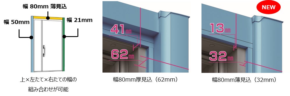 外額縁は昨年の10月にリニューアルし、既設枠に合わせて上×左たて×右たての幅をそれぞれ自由に組み合わせることが可能になりました。この度、既設枠の多くをカバーできる幅80mmに新設枠から見込(奥行き)がスリムな薄見込仕様を新たに設定することで更に選択肢が増えました。