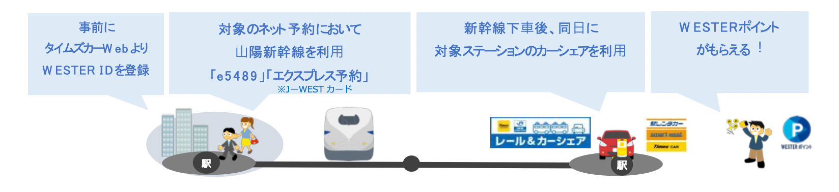 タイムズカーのマイページにて「WESTER ID」を登録された方が、山陽新幹線区間を対象の予約方法で予約後に乗車し、同日に駅付近にある対象のタイムズカーを利用された際に、「WESTERポイント」を100ポイント進呈します。