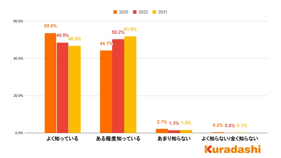 「よく知っている」と回答した人は53.6%、ある程度知っていると回答した人は44.1%でした。2021年と2022年9月に同じ質問を行ったユーザー調査では、「ある程度知っている」と回答した人が最も多かったことから、近年の企業の取り組みやメディアでの報道、小売店でのフードロス削減表示の増加などを背景に、消費者のフードロスへの意識が高まっていることが推察できます。