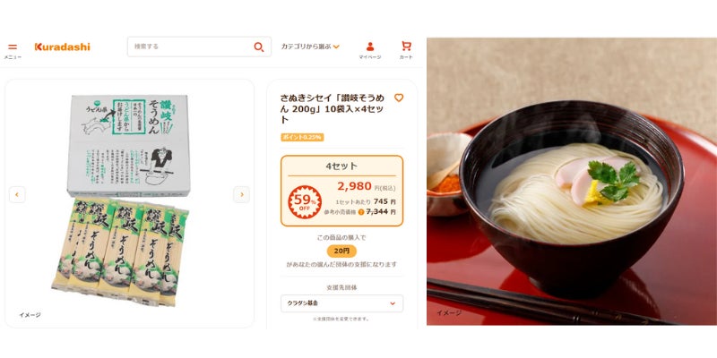そこでKuradashiでは、生活者の皆さまの家計をサポートしつつ、そうめんメーカーさまの課題解決とフードロス削減にもつなげるため、お米に代わる主食として「そうめん」をおトクにご提供いたします。