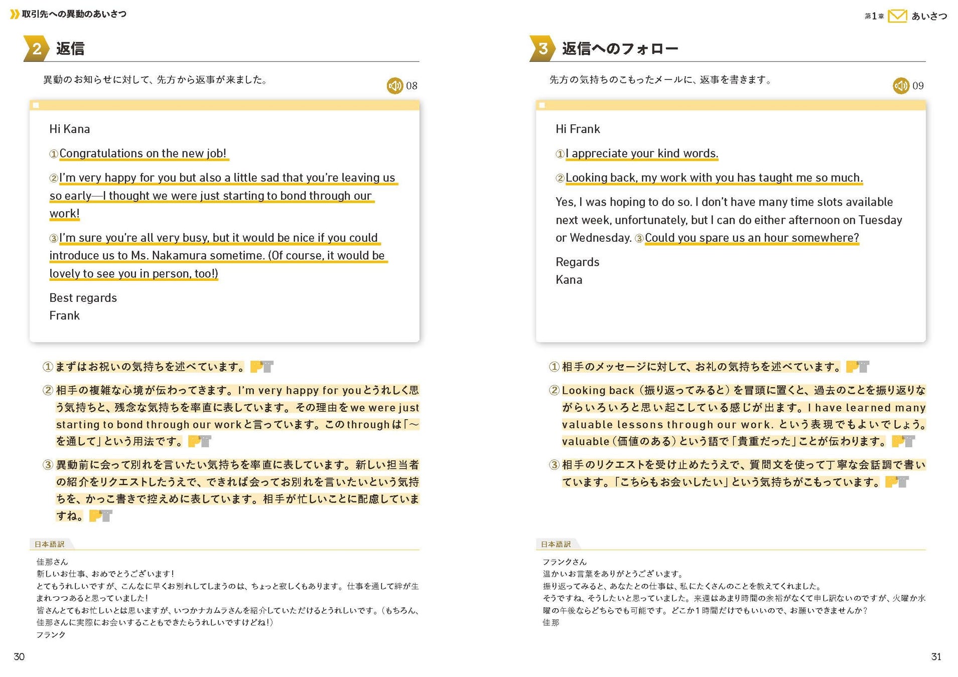 英文メールは音声ダウンロード付き! 近年の英文メールは「丁寧な会話」に近いものになっています。音声を聞き、メールの文面を声に出して読んでみることで、会話での発信力アップにもつながります。シャドウイングも効果的です。