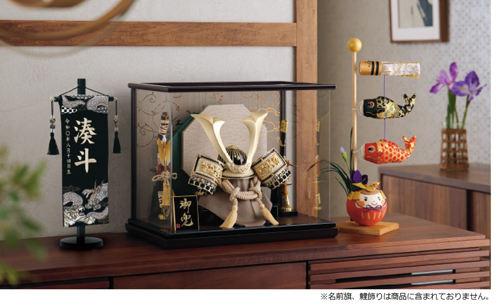 木目調のケースに、落ち着いた色合いの中鍬形の兜を配した、菖蒲の花が映える兜ケース飾りです。