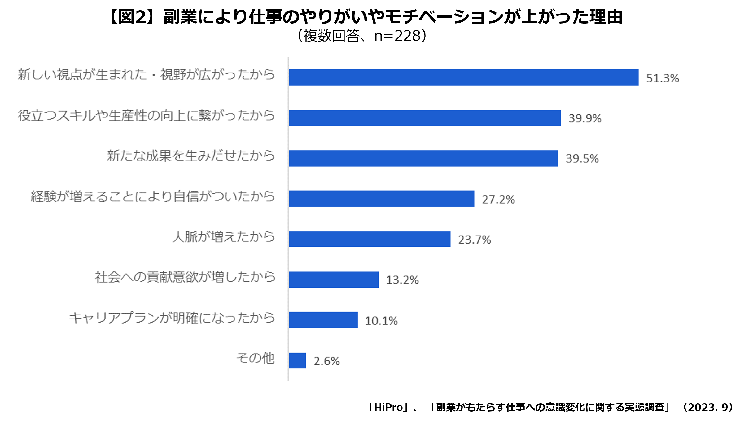 副業をしている会社員を対象に、「副業による仕事のやりがいやモチベーションの変化」を聞いたところ、やりがい・モチベーションのいずれかが「上がった」と回答した人は半数を超える57.0%に。その理由として、「新しい視点が生まれた・視野が広がったから(51.3%)」、「役立つスキルや生産性の向上に繋がったから(39.9%)」、「新たな成果を生みだせたから(39.5%)」が上位を占める結果となりました。(【図1】、【図2】参照)