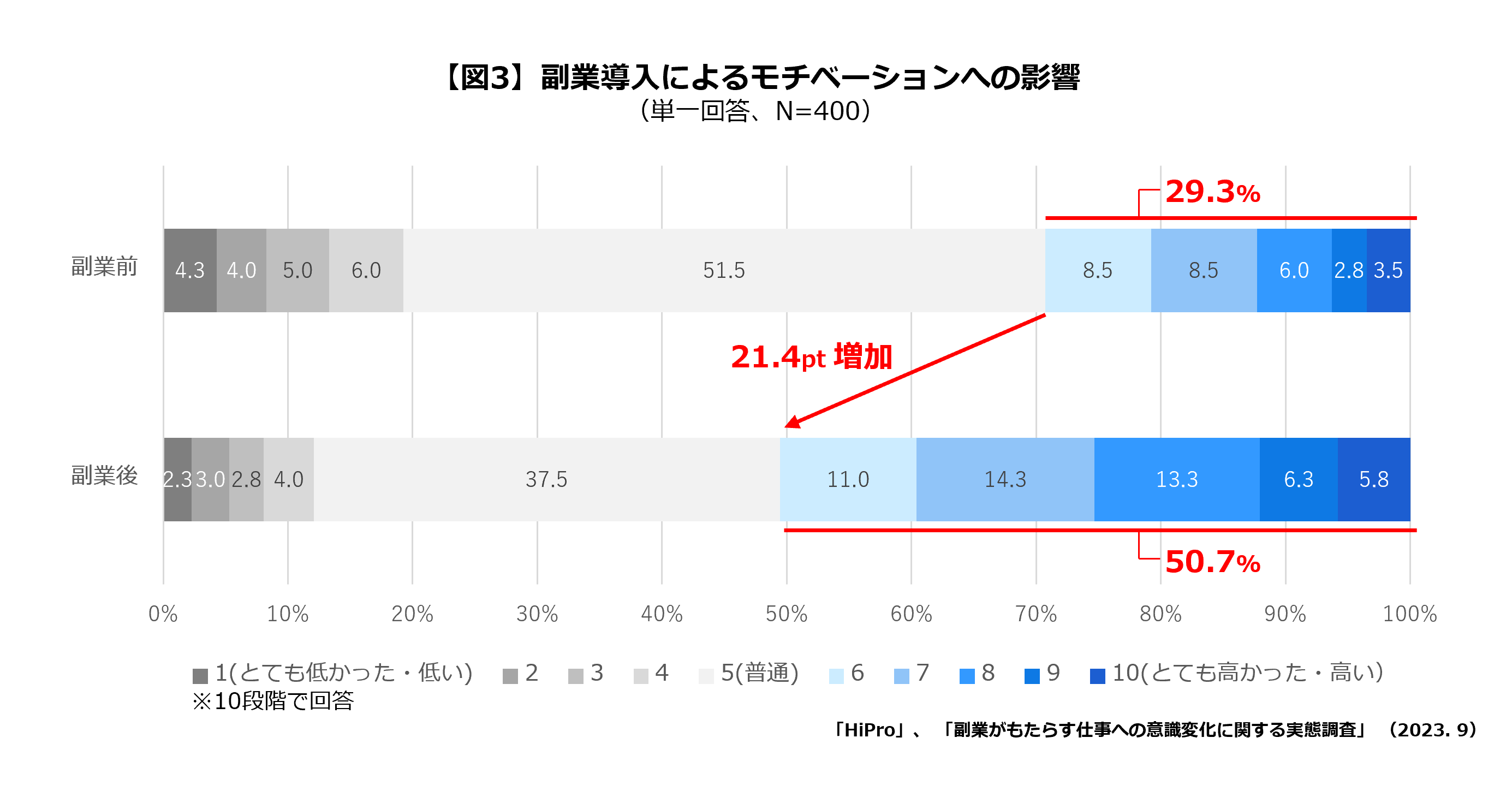 副業が与える影響をさらに紐解くため、「仕事に対するモチベーション」について10段階評価を用いて聞いたところ、副業をする前に「高かった」と回答した人※は29.3%、副業開始後には50.7%が「高い」と回答し、21.4ポイント上昇。副業によって、仕事のモチベーションも上がることが伺える結果となりました。(【図3】参照)