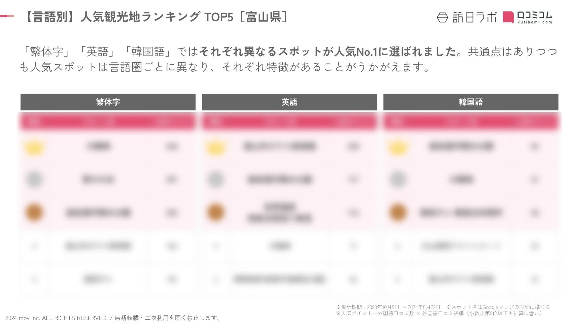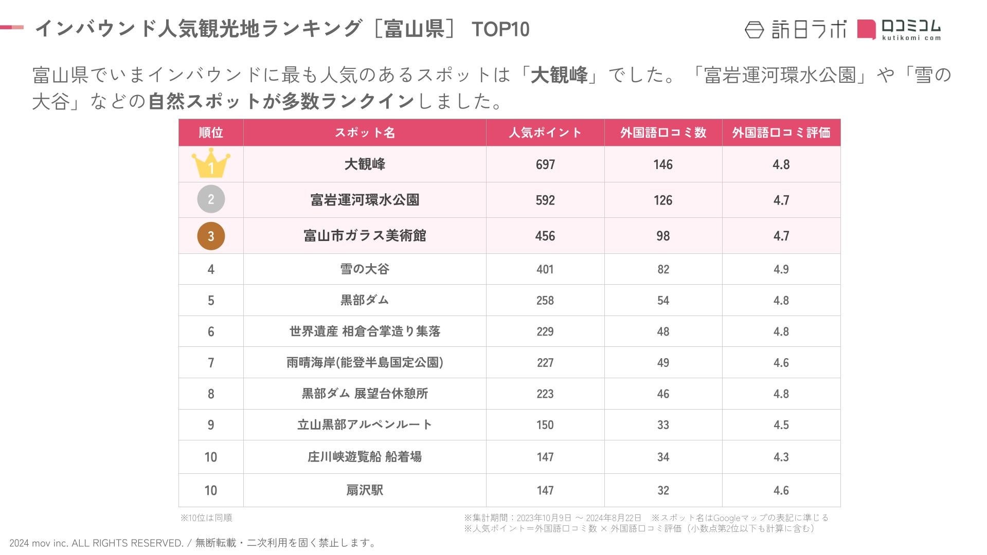 <インバウンド人気観光スポットランキング[富山県編] TOP10>
