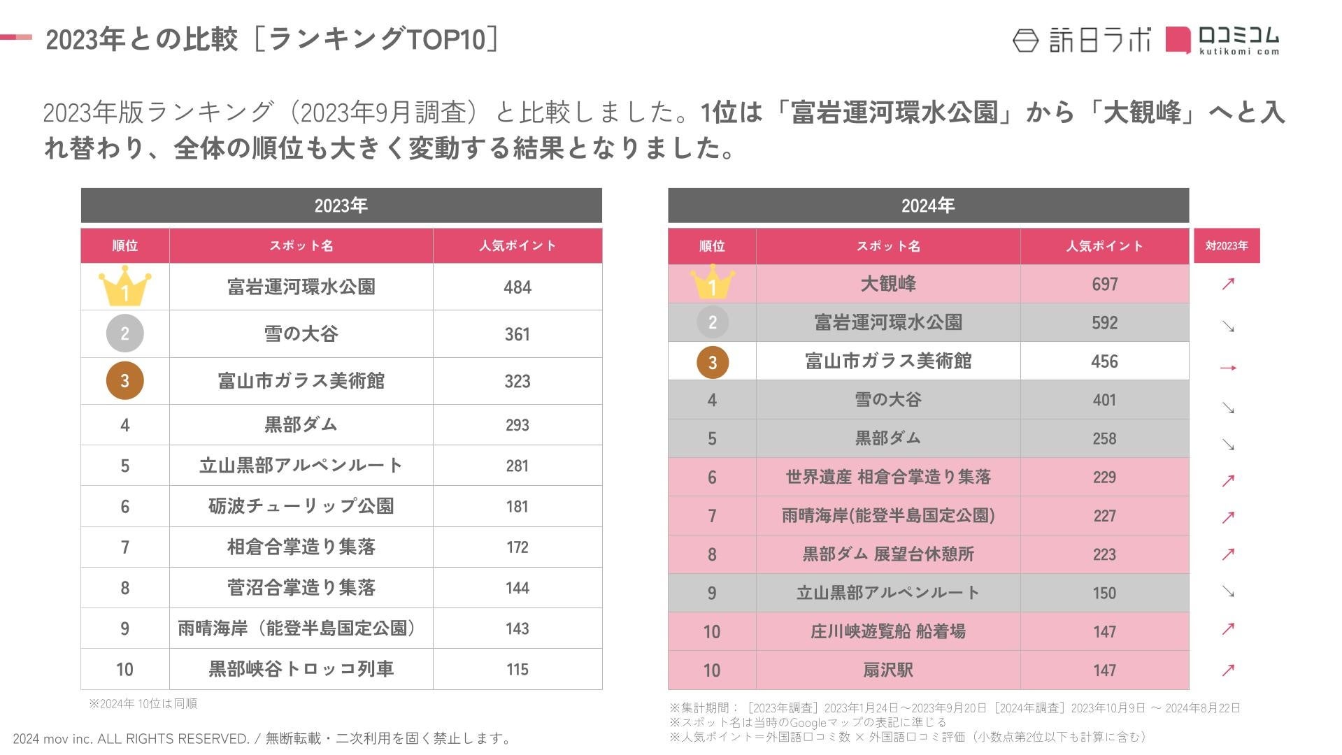 1位は「富岩運河環水公園」から「大観峰」へと入れ替わり、全体の順位も大きく変動しました。