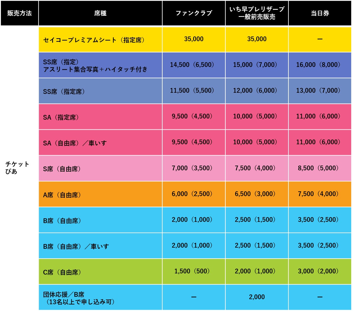 ※セイコープレミアムシート、SS席、SA席、S席、A席の購入でB席・C席での観戦が可能です。