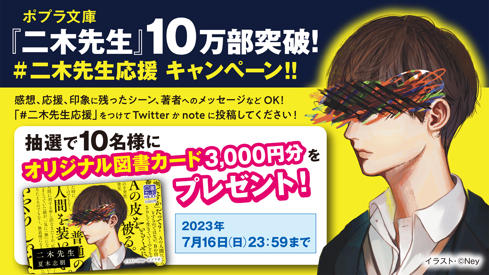 発売から半年以上経った現在もなお、SNSでは日々『二木先生』の感想が投稿され続けています。そこで、10万部突破を記念してTwitterとnoteで応援キャンペーンを実施いたします!「#二木先生応援」をつけて、コメントを投稿してください。本を読んだ感想、印象的だったシーンの引用、著者へのメッセージなど何でもOK!