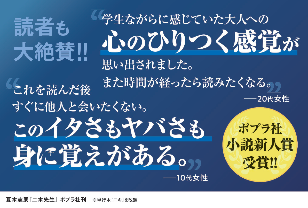 第9回ポプラ社小説新人賞を満場一致で受賞した本作は、2020年9月に『ニキ』というタイトルでポプラ社より単行本化されました。当時、規格外の新人作家と評価された夏木氏に、出版社10社からすぐに2作目のオファーが殺到するなど話題に。『二木先生』と改題した文庫版が2022年9月6日(火)に発売されると、翌日に重版が決定し、その後も勢いはとどまらず、この度、2023年6月、新人作家のデビュー作にして、異例の累計10万部を達成しました!