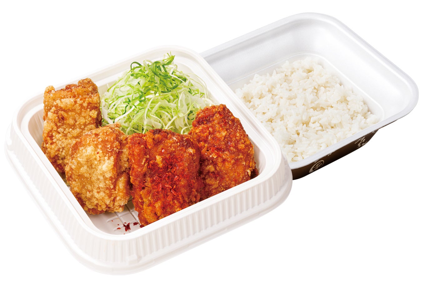 赤カリからあげ2個、カリッともも2個、千切りキャベツ、ご飯