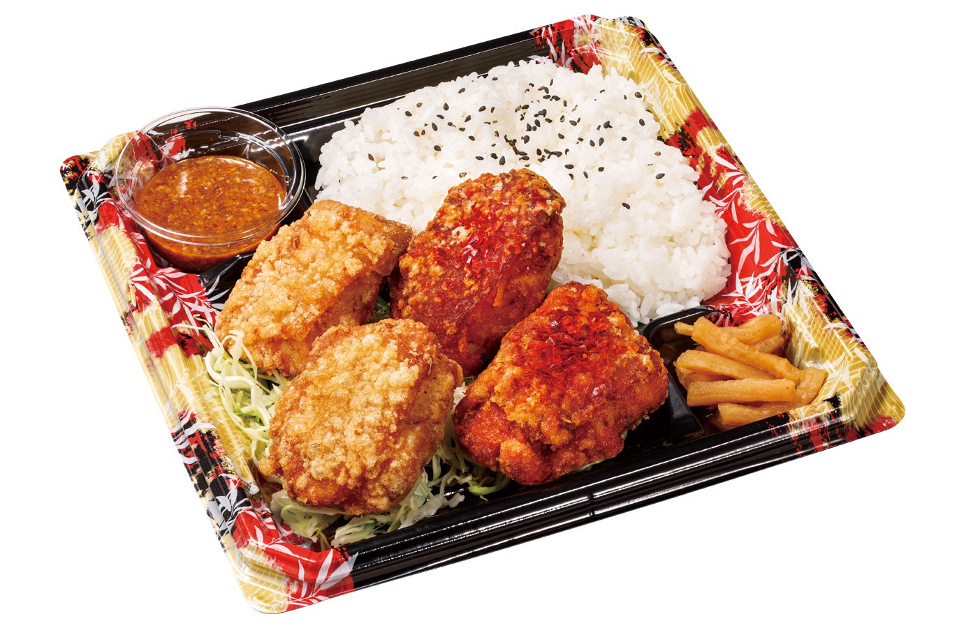赤カリからあげ2個/カリッともも2個/千切りキャベツ/漬物/タレ1種