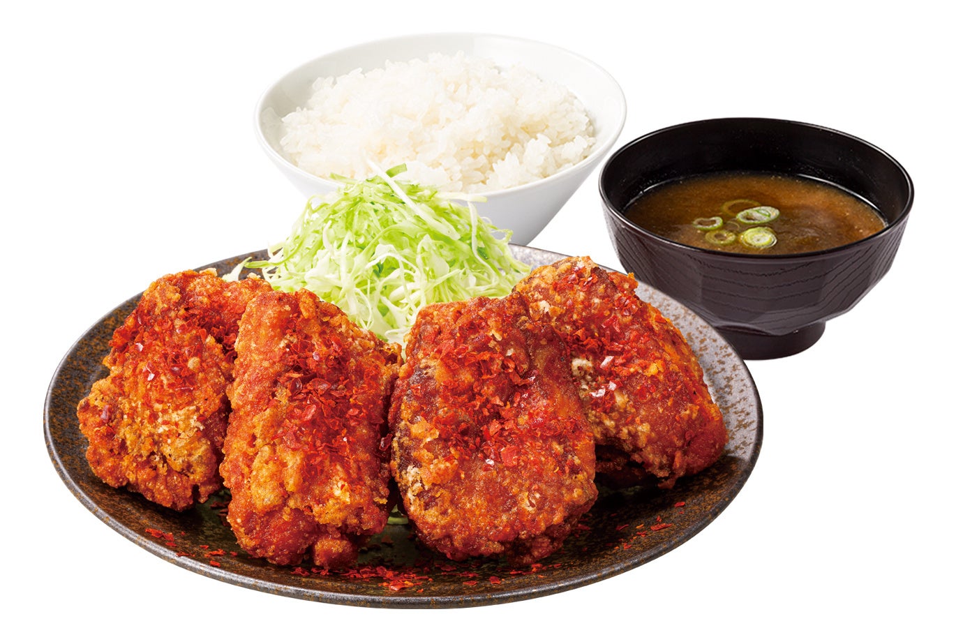 赤カリからあげ4個、千切りキャベツ、ご飯、みそ汁