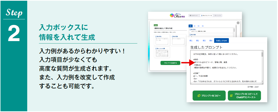 プロンプトの種類は35種類、プロンプトの利用例文は125種類。例文をカスタマイズすることも可能で、作成できるプロンプトは500通り以上になります。