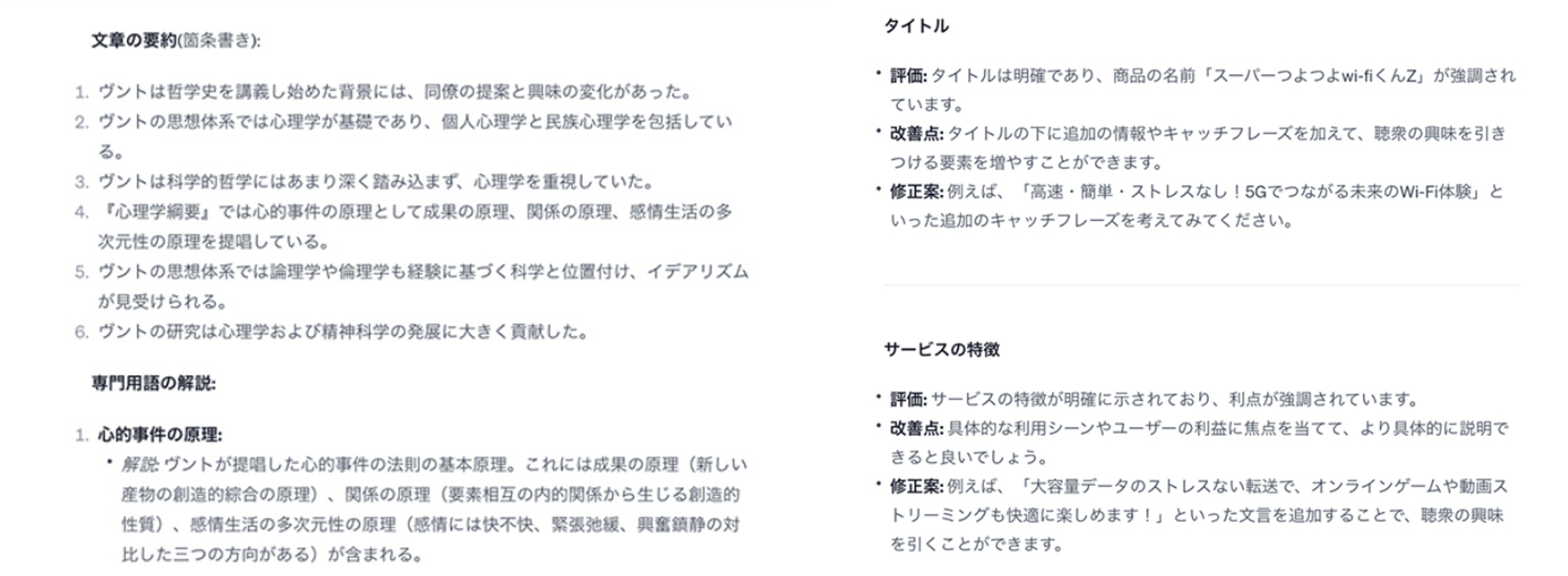 001_ 文書作成 002_ 文章を改良してより洗練された表現を提案する。 003_ 文章の要約と専門用語の解説を行う 004_ 文章の炎上リスクを確認してリライトする 005_「VBA」マークダウン形式のテキストをWord のスタイルへ変換する 006_「VBA」特定のテキストの見た目を一括変更する | 001_ プレゼン向けにスライドの内容を考える 002_ スライドのデザインの提案をしてもらう 003_ プレゼンの改善点を出してもらう 004_「VBA」スライドのひな形作成 005_「VBA」特定のテキストの見た目を一括変更する 006_「VBA」テキストボックスの塗りと枠線の一括変更 |