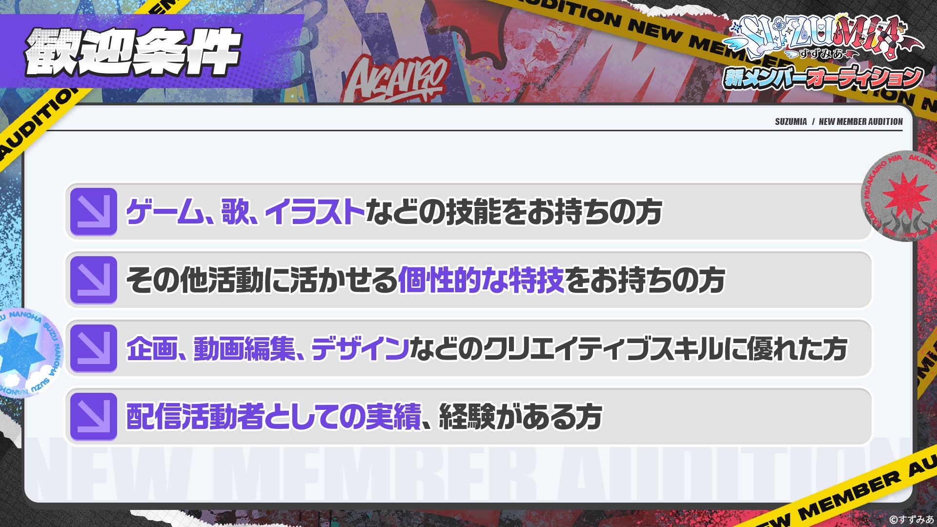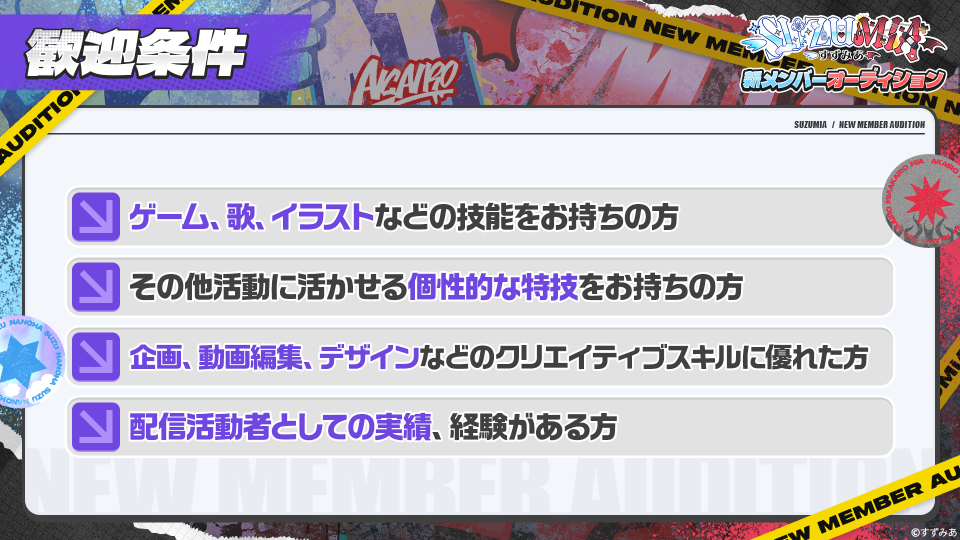 ファンと共に作る最強VTuberユニット「すずみあ」は、2025年12月5日(金)にデビューし、2026年2月にはオンラインでの1on1イベントの開催やグッズ販売を実施。デビューから約4ヶ月となる同年3月末には、YouTubeチャンネル総登録者数13万人を突破しました。さらに、ファンミーティングの開催も決定するなど、デビュー以来、瞬く間に成長してまいりました。この度、共に『最強』を目指す、新メンバのーオーディションを開催します。