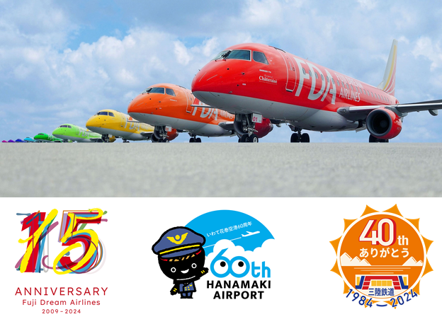 株式会社フジドリームエアラインズ(略称:FDA、本社:静岡県静岡市、代表取締役社長:楠瀬 俊一)は、今年開港60周年を迎えた「いわて花巻空港」並びに開業40周年となる三陸鉄道株式会社(以下「三陸鉄道」、本社:岩手県宮古市、代表取締役社長:石川 義晃)と3社合同の企画列車を運行します。