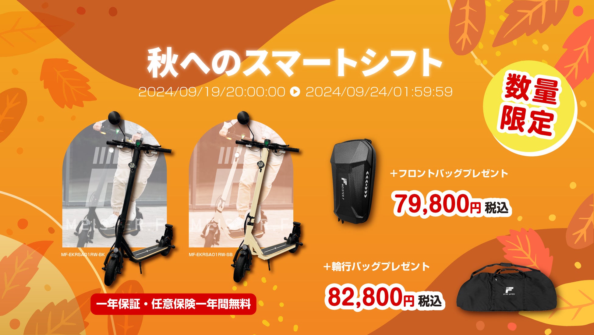 秋の気配が深まるこの季節、楽天「Show !t」では、9月19日(木)からの楽天お買い物マラソンにて、特定小型電動キックボードを特別販売いたします。フロントバッグが無料、さらに輪行バッグも格安で手に入るお得な特典付き。さらに、安心の任意保険1年間無料キャンペーンも継続中。この秋、新しい移動手段で爽やかな風を感じてみませんか?