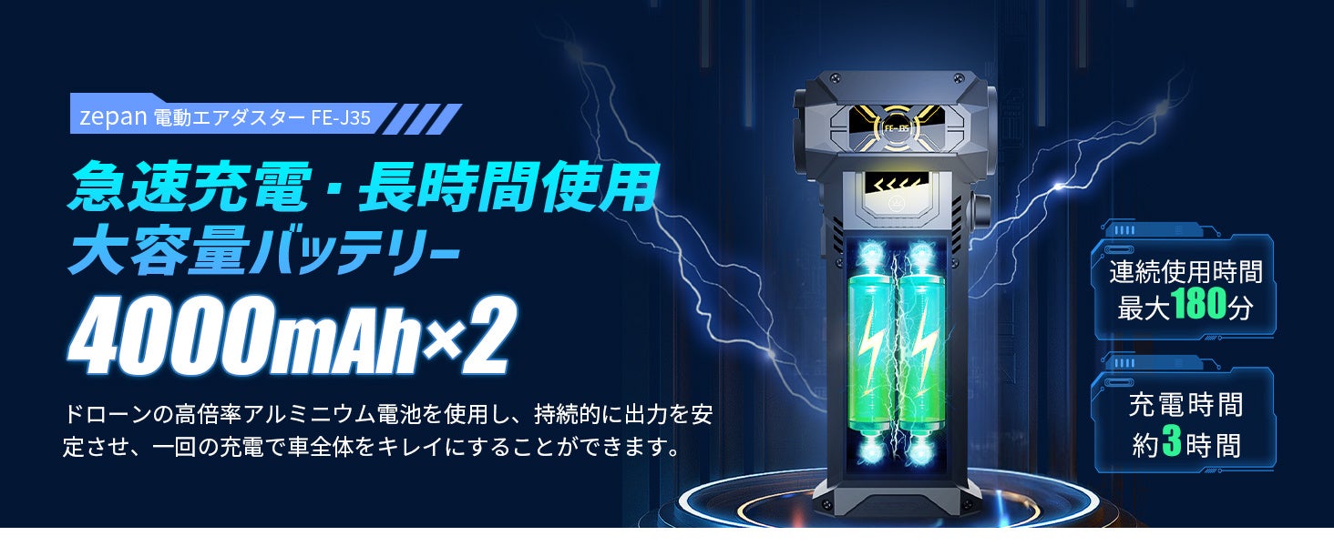 2つの4,000mAh大容量バッテリーを内蔵し、市販の同種製品の約2倍の使用時間を実現。Type-C充電に対応し、フル充電で最大180分の連続使用が可能です。