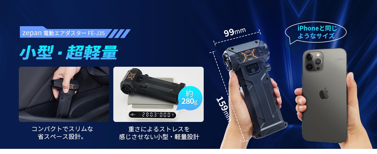 わずか280gの超軽量設計。コードレスで高所や車内など、場所を選ばず手軽に使用可能。コンパクトで収納にも便利です。