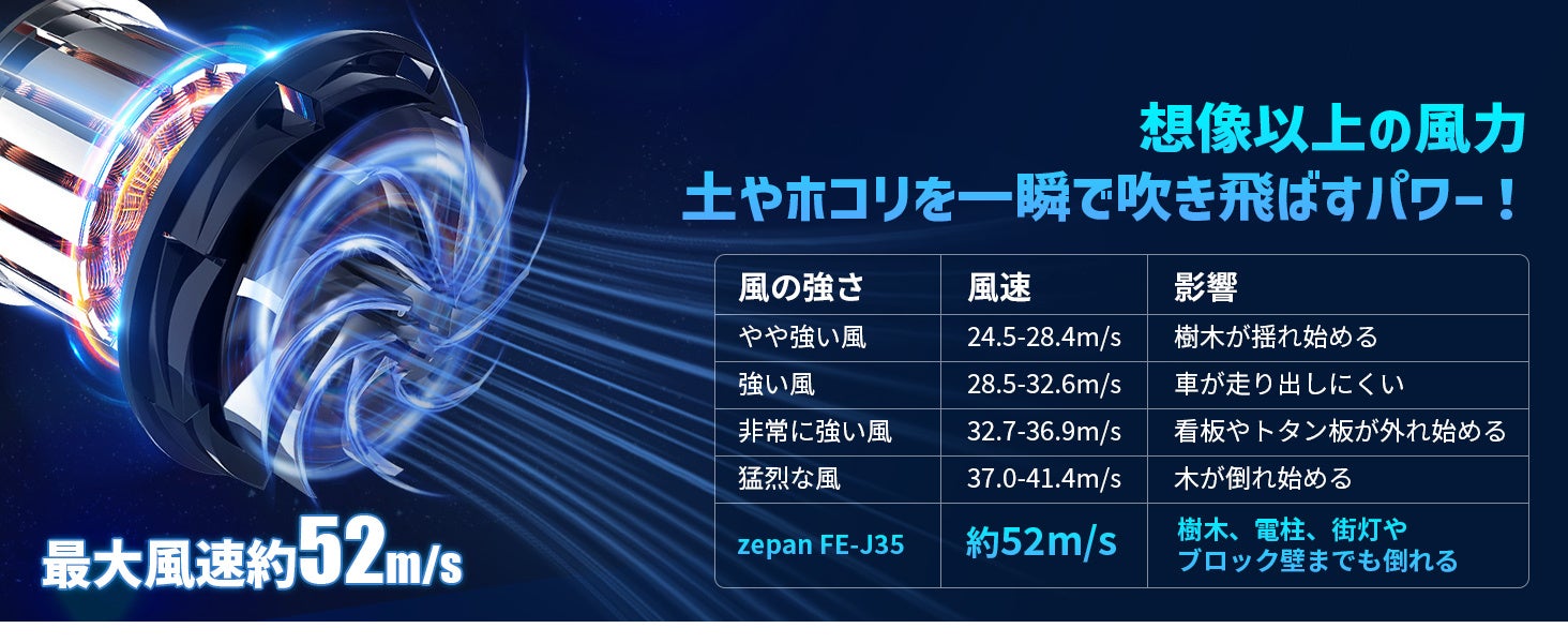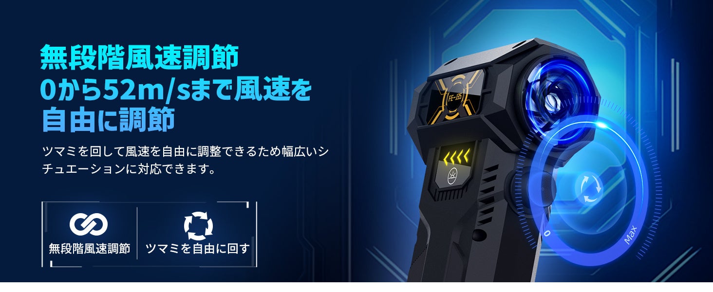 強力なブラシレスモーターを搭載し、最大風速約52m/s。驚異的な回転速度130,000RPMと吹き出し力220gを達成、強力で効率的なエアフローを実現します。