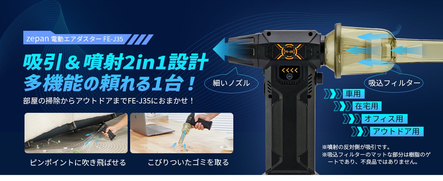 吸引と噴射の2WAY設計で、従来の電動エアダスターより幅広いシーンで活躍します。