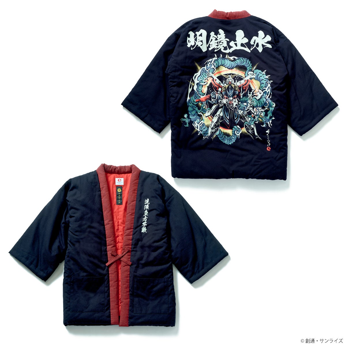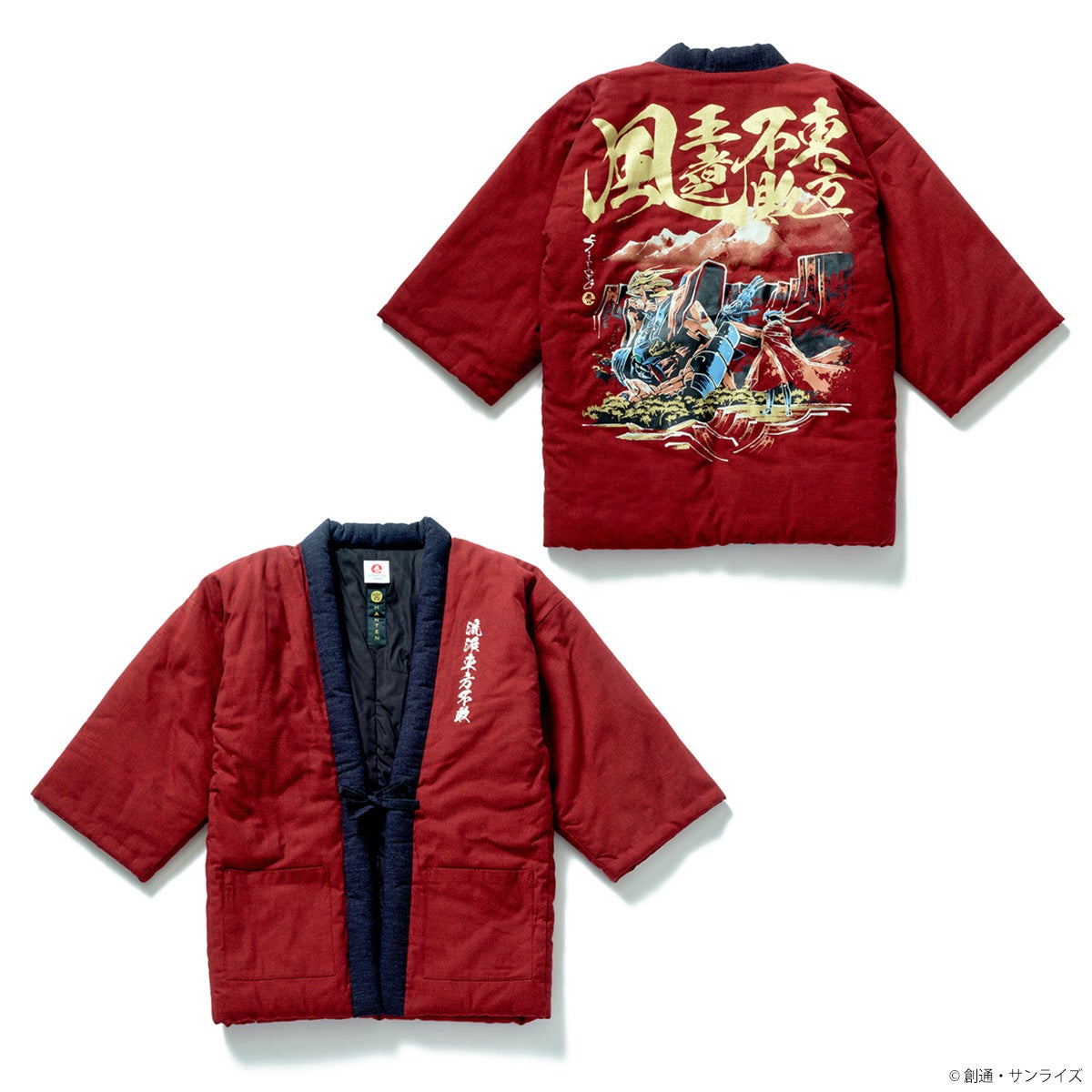 素材・色・形をちょっとモダンに仕立てた半纏は、長年続いたわた入れ半纏の型を見直し、袖下をカットした上品でレトロな印象のモデル。表地には、刺し子が印象的な和木綿「なでしこ」を使用、織りから国内自社で行ない、綿を入れ、とじる作業は手作業で一枚一枚丁寧に行なわれた1着です。背中には躍動感の有る筆絵タッチで、ゴッドガンダムと龍を組み合わせた「ゴッドガンダム柄」、マスターガンダムと虎を組み合わせた「マスターガンダム柄」、オープニング02のカットから「シャイニングガンダム柄」の3種、和のテイストを表現したインパクトの有るデザインです。