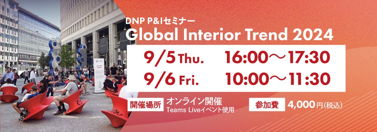 大日本印刷株式会社(DNP)は、2024年9月5日(木)・6日(金)に、世界のインテリアスタイルのトレンドや、家具・キッチン等を彩る「色(Color) ・素材(Material)・仕上げ(Finish)」(CMF)の最新動向などを紹介するオンラインセミナー「Global Interior Trend 2024」を開催します。
