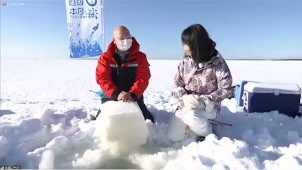 というわけで、東海大学の野坂先生、レポーターの山崎さんがサロマ湖に行って、湖上に張った氷を切り出し、氷の様子や氷の下の生き物の観察を行いました。