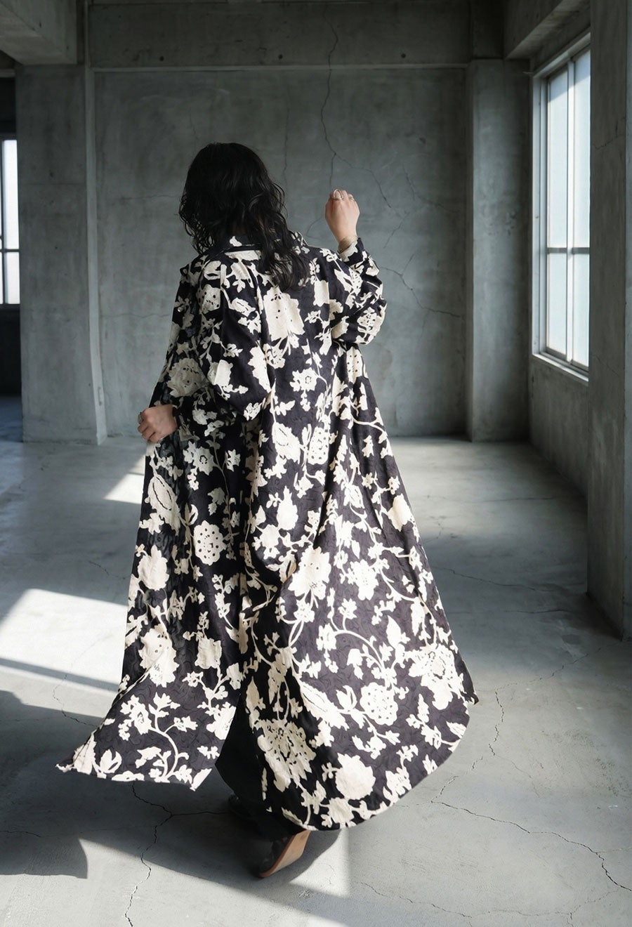 綿100%のドビー生地に繊細な花柄をのせた、奥行きあるロングワンピース。