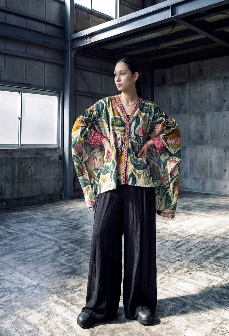 綿100%の風合い豊かなドビー生地に、ヴィンテージ感漂う柄を重ねた存在感ある一枚。