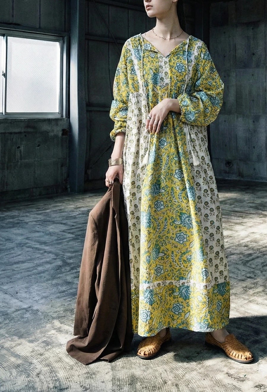 綿100%のドビー生地に木版風の柄を重ねた、奥行きあるロングワンピース。